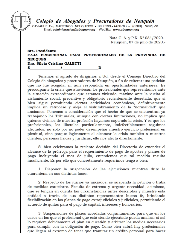 Adjuntamos la nota presentada el día 07/07/2020 a la caja de profesionales de Neuquén